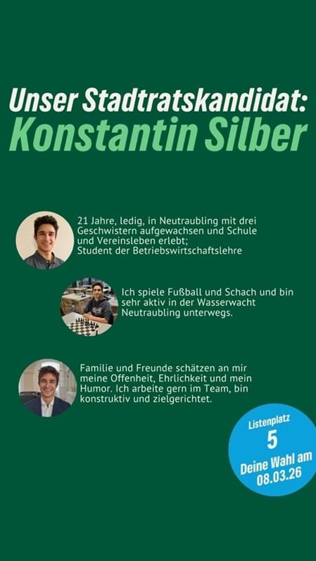 Frischer Wind für Neutraubling. Konstantin Silber ist unser Stadtratskandidat auf Listenplatz 5. Er ist jung und sehr dynamisch, studiert in Regensburg Betriebswirtschaft und ist auch im Vereinsleben sehr aktiv.