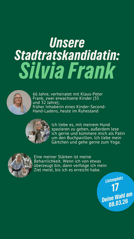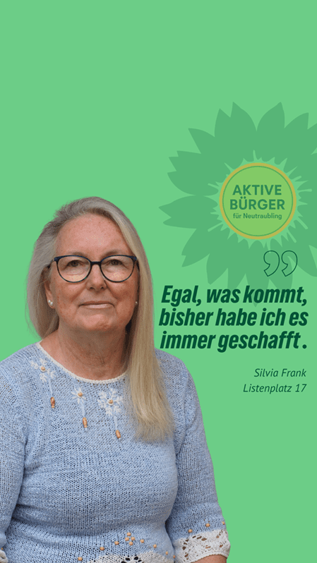 “Nachhaltig aktiv” für Neutraubling. Silvia Frank ist unsere Stadtratskandidatin auf Listenplatz 17. Sie freut sich über faire Äußerungen, sachliche Anregungen und Fragen in den Kommentaren. Gemeinsam mit ihr und vielen anderen gestalten wir Neutraubling “aktiv nachhaltig”.