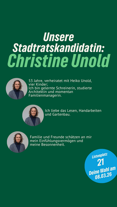 “Nachhaltig aktiv” für Neutraubling. Christine Unold ist unsere Stadtratskandidatin auf Listenplatz 21. Sie freut sich über faire Äußerungen, sachliche Anregungen und Fragen in den Kommentaren. Gemeinsam mit ihr und vielen anderen gestalten wir Neutraubling “aktiv nachhaltig”.