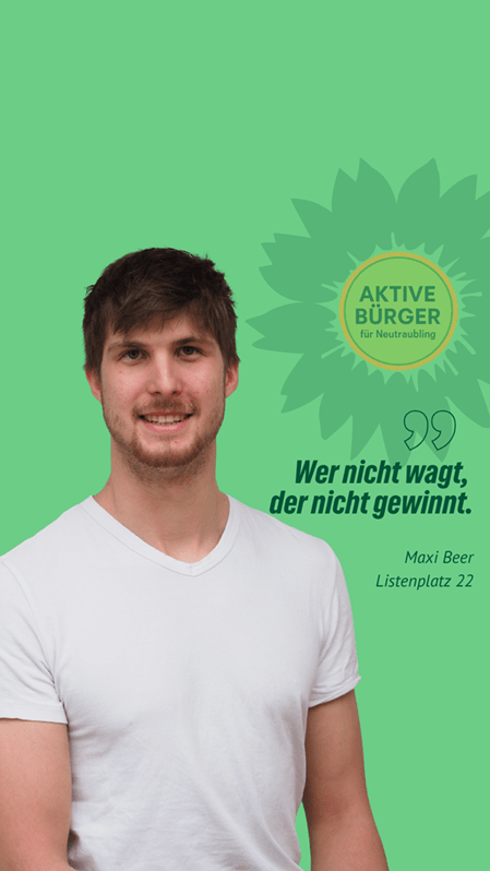 Frischer Wind für Neutraubling. Maxi Beer ist unser Stadtratskandidat auf Listenplatz 22. Er freut sich über faire Äußerungen, sachliche Anregungen und Fragen in den Kommentaren. Gemeinsam mit ihm und vielen anderen gestalten wir Neutraubling “nachhaltig aktiv” und “aktiv nachhaltig”.
