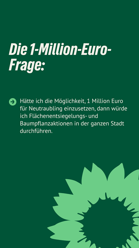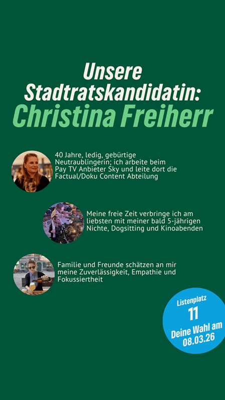 Frischer Wind für Neutraubling. Christina Freiherr ist unsere Stadtratskandidatin auf Listenplatz 11. Sie kandidiert auch für die Grünen auf der Kreistagsliste. Sie freut sich über faire Äußerungen, sachliche Anregungen und Fragen in den Kommentaren. Gemeinsam mit ihr und vielen anderen gestalten wir Neutraubling “aktiv nachhaltig” und “nachhaltig aktiv”.