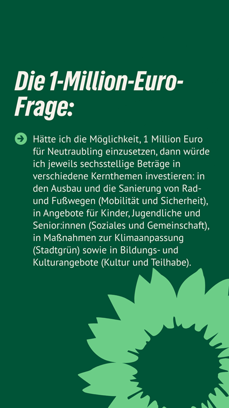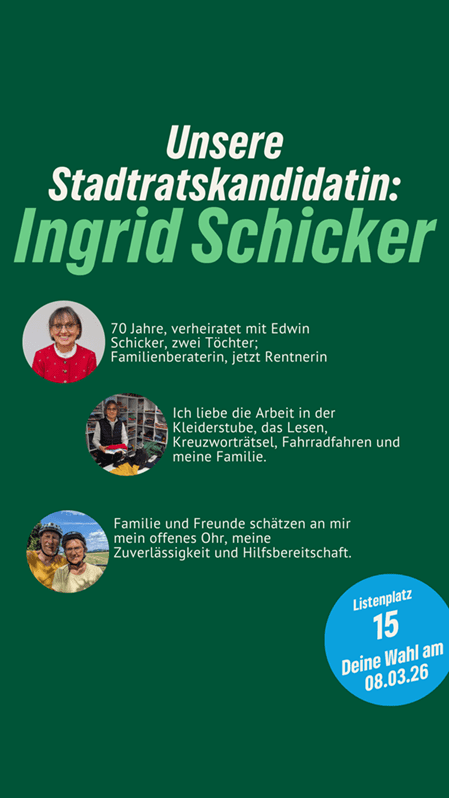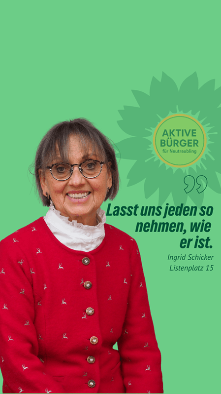 “Nachhaltig aktiv” für Neutraubling. Ingrid Schicker ist unsere Stadtratskandidatin auf Listenplatz 15. Sie kandidiert auch für die Grünen auf der Kreistagsliste. Sie freut sich über faire Äußerungen, sachliche Anregungen und Fragen in den Kommentaren. Gemeinsam mit ihr und vielen anderen gestalten wir Neutraubling “aktiv nachhaltig”.