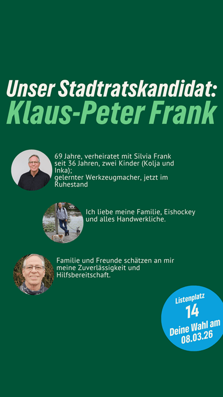 “Nachhaltig aktiv” für Neutraubling. Klaus-Peter Frank ist unser Stadtratskandidat auf Listenplatz 14. Er freut sich über faire Äußerungen, sachliche Anregungen und Fragen in den Kommentaren. Gemeinsam mit ihm und vielen anderen gestalten wir Neutraubling “aktiv nachhaltig”.