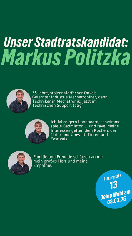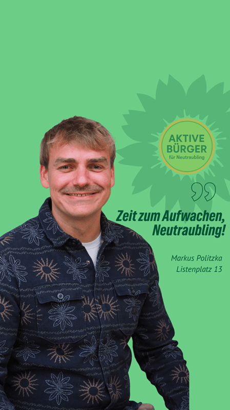 Frischer Wind für Neutraubling. Markus Politzka ist unser Stadtratskandidat auf Listenplatz 13. Er freut sich über faire Äußerungen, sachliche Anregungen und Fragen in den Kommentaren. Gemeinsam mit ihm und vielen anderen gestalten wir Neutraubling “nachhaltig aktiv” und “aktiv nachhaltig”.