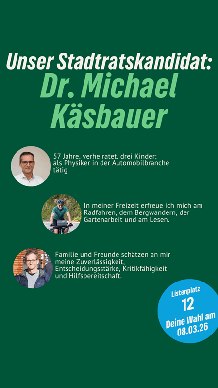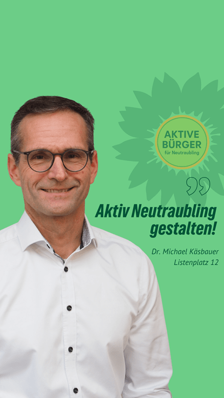 Frischer Wind für Neutraubling. Dr. Michael Käsbauer ist unser Stadtratskandidat auf Listenplatz 23. Er freut sich über faire Äußerungen, sachliche Anregungen und Fragen in den Kommentaren. Gemeinsam mit ihm und vielen anderen gestalten wir Neutraubling “nachhaltig aktiv” und “aktiv nachhaltig”.