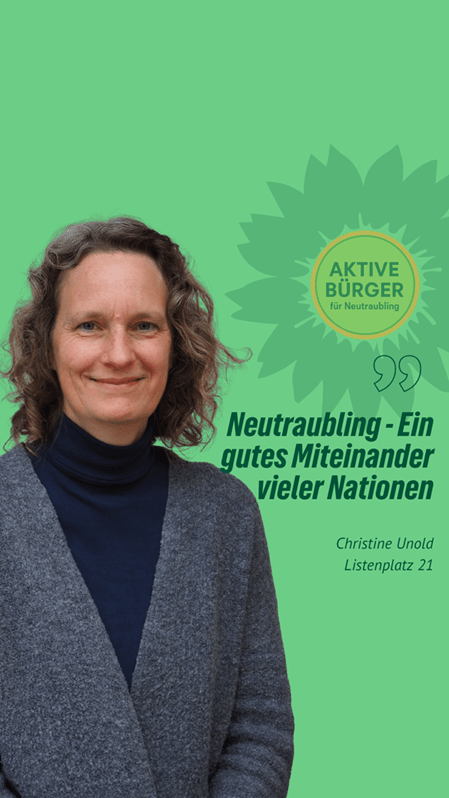 “Nachhaltig aktiv” für Neutraubling. Christine Unold ist unsere Stadtratskandidatin auf Listenplatz 21. Sie freut sich über faire Äußerungen, sachliche Anregungen und Fragen in den Kommentaren. Gemeinsam mit ihr und vielen anderen gestalten wir Neutraubling “aktiv nachhaltig”.