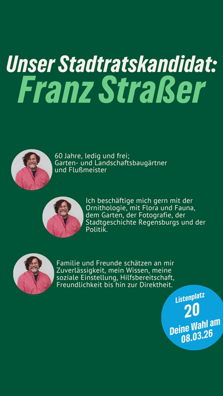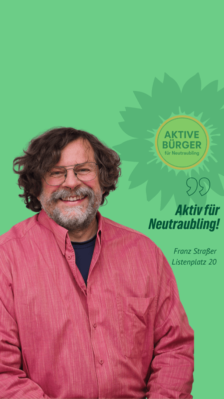 “Nachhaltig aktiv” für Neutraubling. Franz Straßer ist unser Stadtratskandidat auf Listenplatz 20. Er freut sich über faire Äußerungen, sachliche Anregungen und Fragen in den Kommentaren. Gemeinsam mit ihm und vielen anderen gestalten wir Neutraubling “aktiv nachhaltig”.