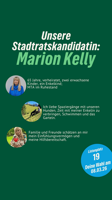 “Nachhaltig aktiv” für Neutraubling. Marion Kelly ist unsere Stadtratskandidatin auf Listenplatz 19. Sie freut sich über faire Äußerungen, sachliche Anregungen und Fragen in den Kommentaren. Gemeinsam mit ihr und vielen anderen gestalten wir Neutraubling “aktiv nachhaltig”.
