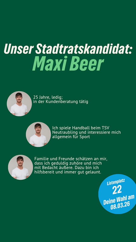 Frischer Wind für Neutraubling. Maxi Beer ist unser Stadtratskandidat auf Listenplatz 22. Er freut sich über faire Äußerungen, sachliche Anregungen und Fragen in den Kommentaren. Gemeinsam mit ihm und vielen anderen gestalten wir Neutraubling “nachhaltig aktiv” und “aktiv nachhaltig”.