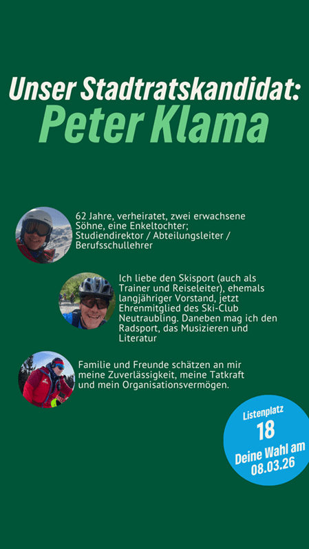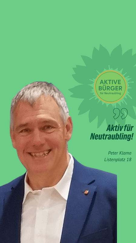 “Nachhaltig aktiv” für Neutraubling. Peter Klama ist unser Stadtratskandidat auf Listenplatz 18. Er freut sich über faire Äußerungen, sachliche Anregungen und Fragen in den Kommentaren. Gemeinsam mit ihm und vielen anderen gestalten wir Neutraubling “aktiv nachhaltig”.