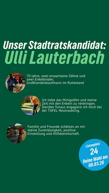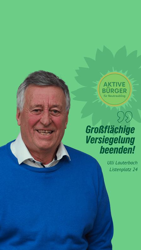 “Nachhaltig aktiv” für Neutraubling. Ulli Lauterbach ist unser Stadtratskandidat auf Listenplatz 24. Er freut sich über faire Äußerungen, sachliche Anregungen und Fragen in den Kommentaren. Gemeinsam mit ihm und vielen anderen gestalten wir Neutraubling “aktiv nachhaltig”.