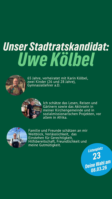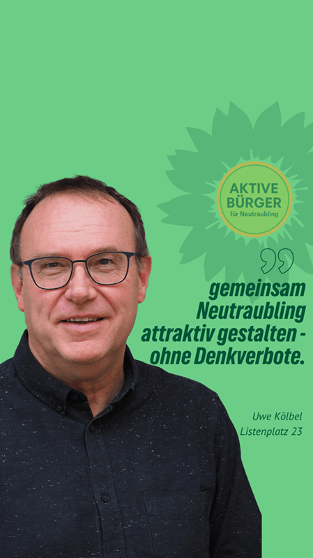 “Nachhaltig aktiv” für Neutraubling. Uwe Kölbel ist unser Stadtratskandidat auf Listenplatz 23. Er freut sich über faire Äußerungen, sachliche Anregungen und Fragen in den Kommentaren. Gemeinsam mit ihm und vielen anderen gestalten wir Neutraubling “aktiv nachhaltig”.
