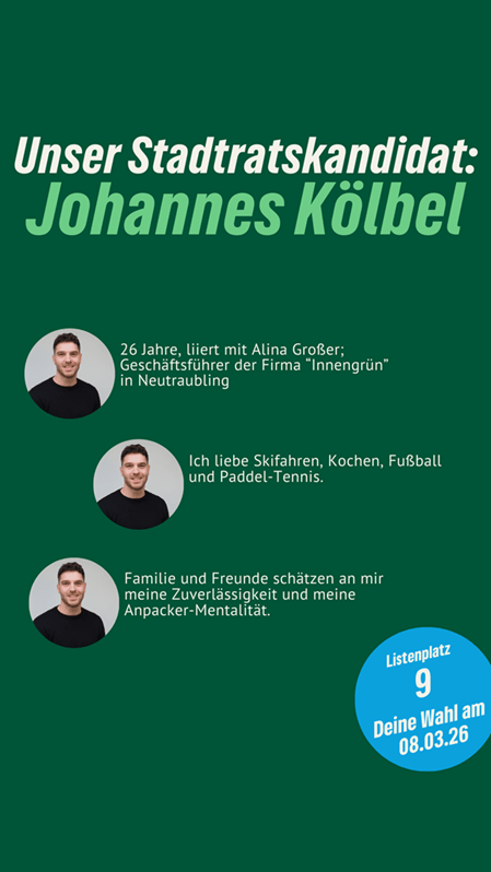Frischer Wind für Neutraubling. Johannes Kölbel ist unser Stadtratskandidat auf Listenplatz 9. Er freut sich über faire Äußerungen, sachliche Anregungen und Fragen in den Kommentaren. Gemeinsam mit ihm und vielen anderen gestalten wir Neutraubling “nachhaltig aktiv” und “aktiv nachhaltig”.