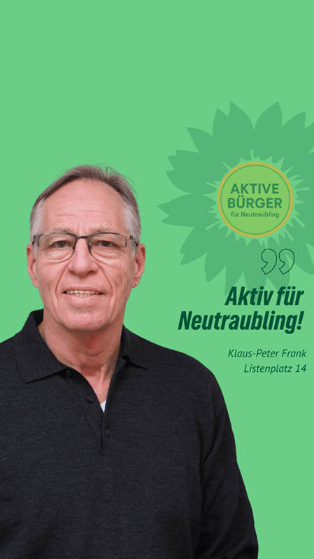 “Nachhaltig aktiv” für Neutraubling. Klaus-Peter Frank ist unser Stadtratskandidat auf Listenplatz 14. Er freut sich über faire Äußerungen, sachliche Anregungen und Fragen in den Kommentaren. Gemeinsam mit ihm und vielen anderen gestalten wir Neutraubling “aktiv nachhaltig”.