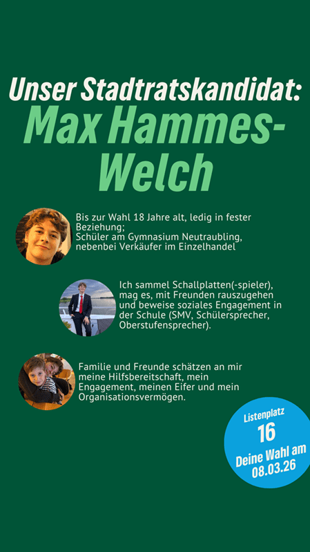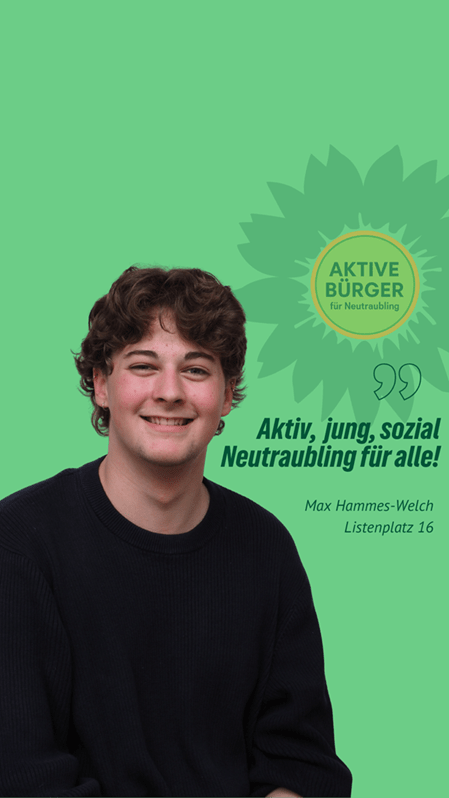 Frischer Wind für Neutraubling. Max Hammes-Welch ist unser Stadtratskandidat auf Listenplatz 16. Er freut sich über faire Äußerungen, sachliche Anregungen und Fragen in den Kommentaren. Gemeinsam mit ihm und vielen anderen gestalten wir Neutraubling “nachhaltig aktiv” und “aktiv nachhaltig”.